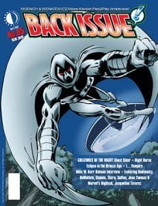 This specific issue of ‘Back issue’ is devoted to ‘creatures of the night’ on the cover although this is a wide brief or why include Marc Spector aka Moon Knight for its opening volley cos he’s hardly a creature. Here we have an intensive interview with his creator/writer Doug Moench and artist for much of the title’s original run, Bill Sienkiewicz. I think the biggest surprise was Moench never saw Moon Knight as anything more than an incidental character but whose appeal to his various editors kept him going. Moench always saw him as a design to take on ‘Werewolf By Night’ not a take on Batman as many thought back in the day. With his multiple identities, I tended to see Moon Knight more akin to The Shadow myself. Of particular interest is reading Moench discussing how he prepares his scripts and more detailed than the traditional Marvel way.