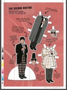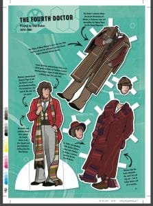 From thereon, we are into paper doll territory with illustrations by Ben Morrie and information from Simon Guerrier covering 26 actors who played 12 Doctors and 13 assorted companions, mostly female with only Rory as the, literally, odd man out. Do I have to name the only villainess? For those missing important information, on the left hand page top corner is the name of the original costume designer involved with each character’s clothes. Around each of the paper dolls and assorted extra costumes and heads, there is a lot of information although little connecting them together. I mean, reading this, you would have thought Guerrier would have recognised that the Pertwee and McGann regenerations both got their initial selection of clothes from hospitals where they regenerated.