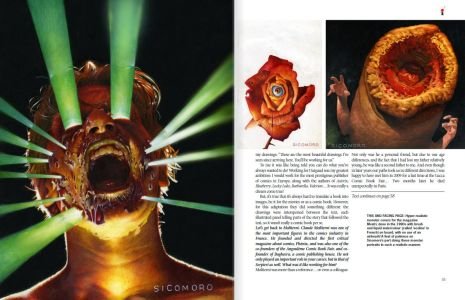 Just in case you think editor Diego Cordoba is keeping to deceased artists, the next, Italian artist Eugenio Sicomoro (1952- ) is very much alive and equally jaw-dropping not only with his detailed art, especially with hair, but also his humour and texturing. From humans to aliens to robots to zombies, he encompasses them all. I checked on how much of his work is available and other than a couple Italian graphic novels, very little. It does get a bit easier if you look under the books he’s worked on like ‘Dylan Dog’, which should enforce you to get this ‘Illustrators’. I’m in awe at his pencil-work. He has a pencil for detail is an art and the best artists make it easy which belies the time it takes to look that good.