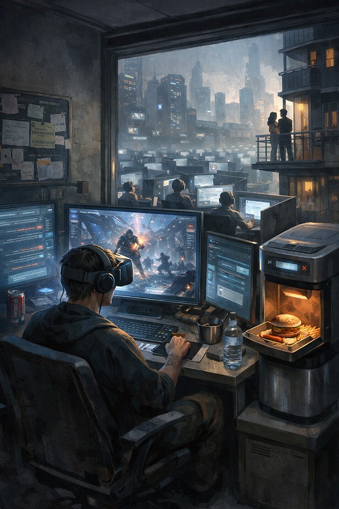 All work and no play isn’t healthy, but that’s what the digital world and the game are there for. It can even be played on an exercise bike, courtesy of automatic delivery systems, when there is a need to lose a few pounds. Who really needs people around. In the old days, there was far too much smoking and drinking. Staying in one place all the time was good for the environment. No cars. No ships. No planes. At least those with people onboard. It was a safer environment. In the old days, there was a lot of pollution from car engines. Battery cars might even explode if overcharged. The air, when we might go outside, is at least breathable, but who goes outside?