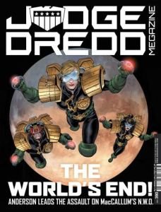 I passed a W.H. Smith’s the other day and picked up Judge Dredd Megazine # 390 and 2000AD # 2059, partly to see what they’re like now and partly to strike a blow against American cultural imperialism by purchasing home-grown British comics. The first thing I learned is that they are quite expensive: £5.99 for the Megazine and £2.75 for the Prog. Apart from that, they haven’t changed much. I should say from the start that because of the anthological and episodic nature of British comics, featuring several strips and only parts of a whole story, you can’t judge them fairly from one issue. Unfair judging follows.