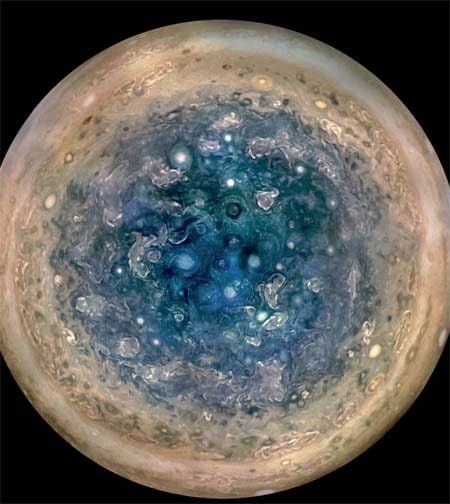 Among the findings that challenge assumptions are those provided by Juno’s imager, JunoCam. The images show both of Jupiter’s poles are covered in Earth-sized swirling storms that are densely clustered and rubbing together.
