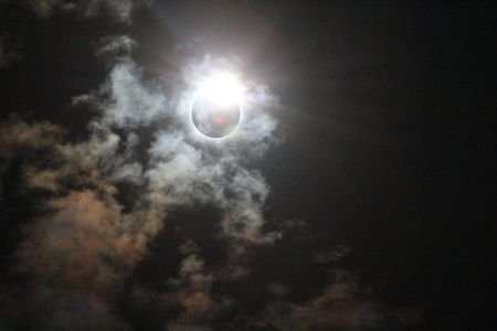 As first contact approached, everything settled down. While there was little to see, even through the must-wear special glasses, there was the tension of expectation. The few clouds were high and wispy. The first part of an eclipse is slow, patience is needed but as totality approaches, the twilight seeps into the atmosphere. The world becomes chiaroscuro, colour drains away. The temperature, hot in direct sunlight, drops to a comfortable level. The sun is black edged by silver. At totality, second contact, the corona flares and bright amethyst flares dot the perimeter. For three minutes and five seconds the world is still and silent, then the searing white of the diamond ring and it is over. Slowly colour and sound reassert themselves. The eclipse is not over but there is less interest now. It is time for the party to begin.