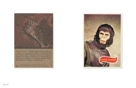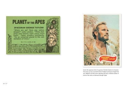 Unlike the other trading cards books Abrams have released so far, ‘Planet Of The Apes: The Original Topps Trading Card Series’ introduced by former Topps creative director Gary Gerani, this book covers all of their Apes card sets. So what you have is a 46 card set for the original 1969 film ‘Planet Of The Apes’ and the 1975 TV series at 66 cards and finally, the 90 cards and all their extras for the 2001 film. You get a lot of other things including seeing the wrappers and boxes they were put on the shelves with.