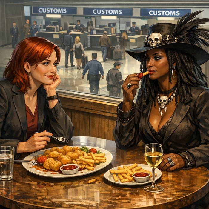 ‘I’m glad I spiked her for this meal’, Sara Seeker said quietly to the statuesque Libertine Rush, Baroness Samedi, sitting opposite her in the café, looking down at the people coming through customs. Half of the meal was still on the plate. ‘I had to spike her for a child’s portion. It’s even bigger than an adult version back home.’