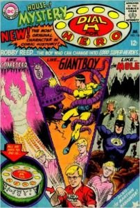 Sockamagee! I have a vague memory of fondness for ‘Dial H For Hero’ when I was very young, so I bought this ‘Showcase’ volume to see what it’s like. The fun started in House Of Mystery # 156 (Jan 1966) when boy genius Robby Reed accidentally falls into a cavern and finds a strange dial. He takes it home to the timber-frame house with the white picket fence where he lives with his grandpa and grandma. Being a genius, Robby has a lab hut in the rear of the house and there he deciphers the strange writing on the dial and follows the instructions to dial H-E-R-O (in translation). Instantly, he is transformed into Giant Boy. He can fly and goes to rescue a plane in trouble. Later, he dials H and becomes the Cometeer and the Mole to help save a chemical works from destruction. The evil Mister Thunder has been hired to sabotage it by a rival factory owner. In the following issue, the Thunderbolt gang run afoul of The Human Bullet, Super-Charge and the Radar-Sonar Man. It ends with Mister Thunder shaking his fist as the sky and promising revenge on meddling super-heroes as he goes off to prison.