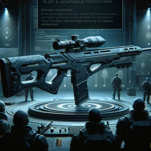 ‘Now, fine people, we have here the latest state of the art weapon. A prototype gun, capable of acting as a sniper as well as close-up. Automatic and semi-automatic. It is adaptable to take any calibre of ammunition. The material is composite. Put in a suitable case, it can pass through any security x-ray machine and not detect metal. Great for those who want to take it home with you. All carbide. This piece, with all of its accessories, will make you as an assassin perfect for any upcoming hits.