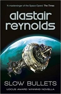 ‘Slow Bullets’ is the second of Alastair Reynolds’ novellas I’ve read recently, the other being ‘The Iron Tactician’ and, like that book, the scope of the tale comes across just as vast as his much fatter novels, with a sense of history and scale that place the tale as part of something far larger. In keeping with the size of this book, the action is limited to a single point-of-view character rather than multiple, interlocking strands. Scur is a soldier fighting at the tail end of a vast interstellar war who, instead of going home, awakes from a sleeping capsule on an interstellar ship full of soldiers and criminals in an unknown star system. She is soon thrust into the centre of the action in an attempt to stave off anarchy and discover where they are and why.