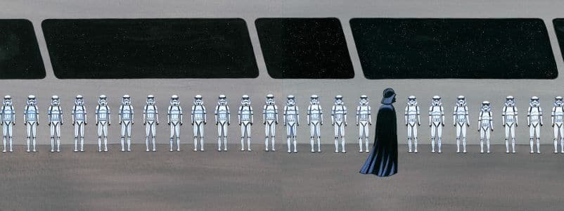 The book is based on an earlier title written Stones called ‘Goodbye, Penguins’ in which fifteen penguins meet similarly odd and funny ends. Being a life-long ‘Star Wars’ fan, though, has given Stones the impetus to kill off even more troopers than penguins through a variety of scenes from the ‘Star War’s saga, including ‘Rogue One’. My favourite pieces illustrated some of the absurdities of the universe, such as the two stormtroopers who ‘wear the wrong armour’.