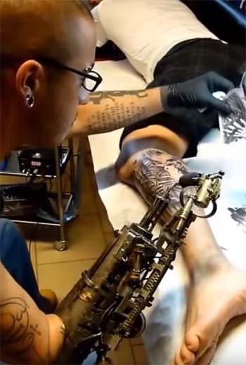 You have to give it to tattoo artist J.C. Sheitan Tenet – he’s not just content with giving clients steampunk tattoos, he also got his friend J.L. Gonzal to create a steampunk prosthesis for him to use, when dishing out that steampunk ink.