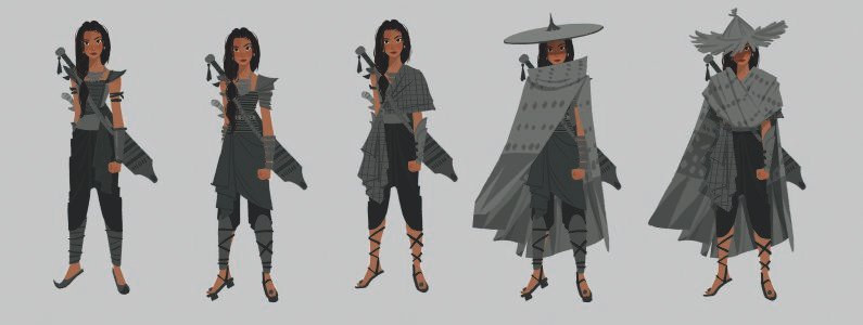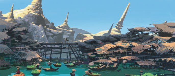 Not unusually, this book is more to do with pre-production and character development and settings. Oddly, the opening two paintings on page 12-13 wouldn’t have been out of place in a fantasy paintings book but then everything is brought back a little for the needs of animation. More so as we see Raya grow up and Sisu being able to look human. Getting the tone of the costumes right was more to do with remembering leather is a heavy material and a need to make things lighter if to appear practical. An element often forgotten with fabrics in animation. Raya is also given a more practical animal to ride in the form of a Tuk Tuk, that appears to be a cross between a cat and a pangolin, whom his creators thinks steals the film. Other unusual pack animals also includes Serlots, a cross between a serval and caracol.