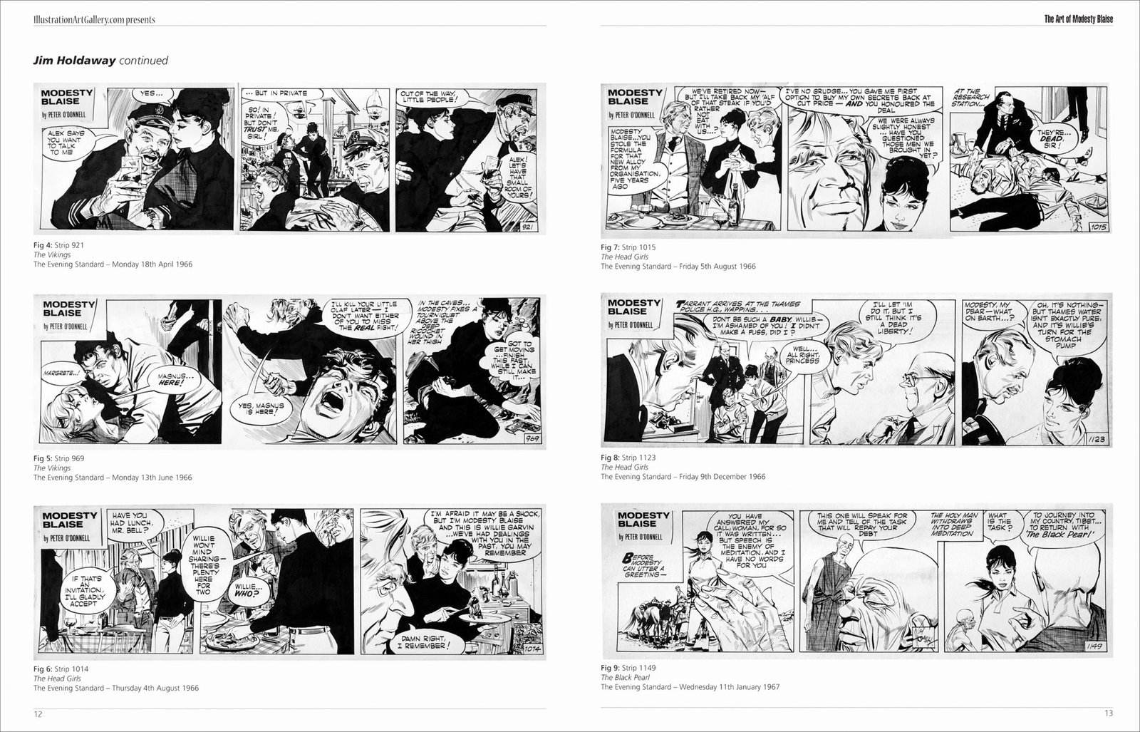 Having reviewed The Book Palace’s ‘Illustrators’ magazine in recent months and I hope some of you who had a look at their website enough to know that they also have a market in original comicbook and newspaper strip art. As such, it would hardly be a surprise if there wasn’t a quantity of ‘Modesty Blaise’ strips included. Although it’s outside of my price range, an opportunity to see even these on the Net is a precious thing. However, publisher Geoff West went one better and has produced a limited 600 copy edition called ‘The Art Of Modesty Blaise’ which features all strips he had available as drawn/inked by Jim Holdaway, Enric Badia Romero, John M. Burns, Pat Wright and Neville Colvin.