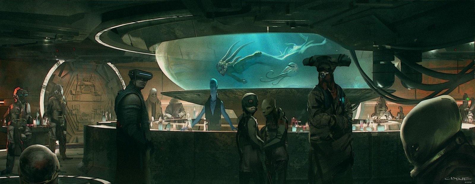 “One idea I had was, what if there’s literally a big fish tank? The idea came from ‘The Right Stuff’, where they’re all at a tiki bar and this mermaid comes down to flirt with one of the astronauts.” Clyne