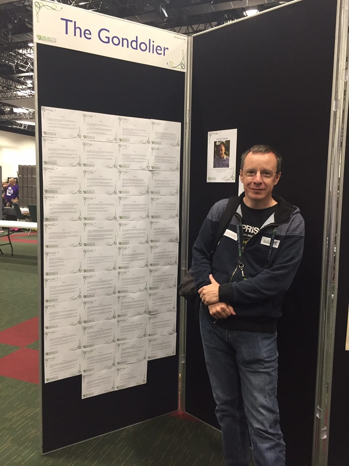 There didn’t seem to be as many dealers as I remember from the London WorldCon and, disappointingly, no second-hand book stalls which I normally enjoy browsing through. There were tables manned by representatives of fan groups and SF associations from around the world, though, and it was fascinating to chat to them about Science Fiction from their respective countries. Translated fiction and languages is a particular interest of mine, so I also attended panel discussions on translations and on constructed languages, or conlangs. ‘The Gondolier’ has been translated into three conlangs: Esperanto, Glossa and Klingon. Not that I would dare to suggest to any Klingons that their language was a construct!